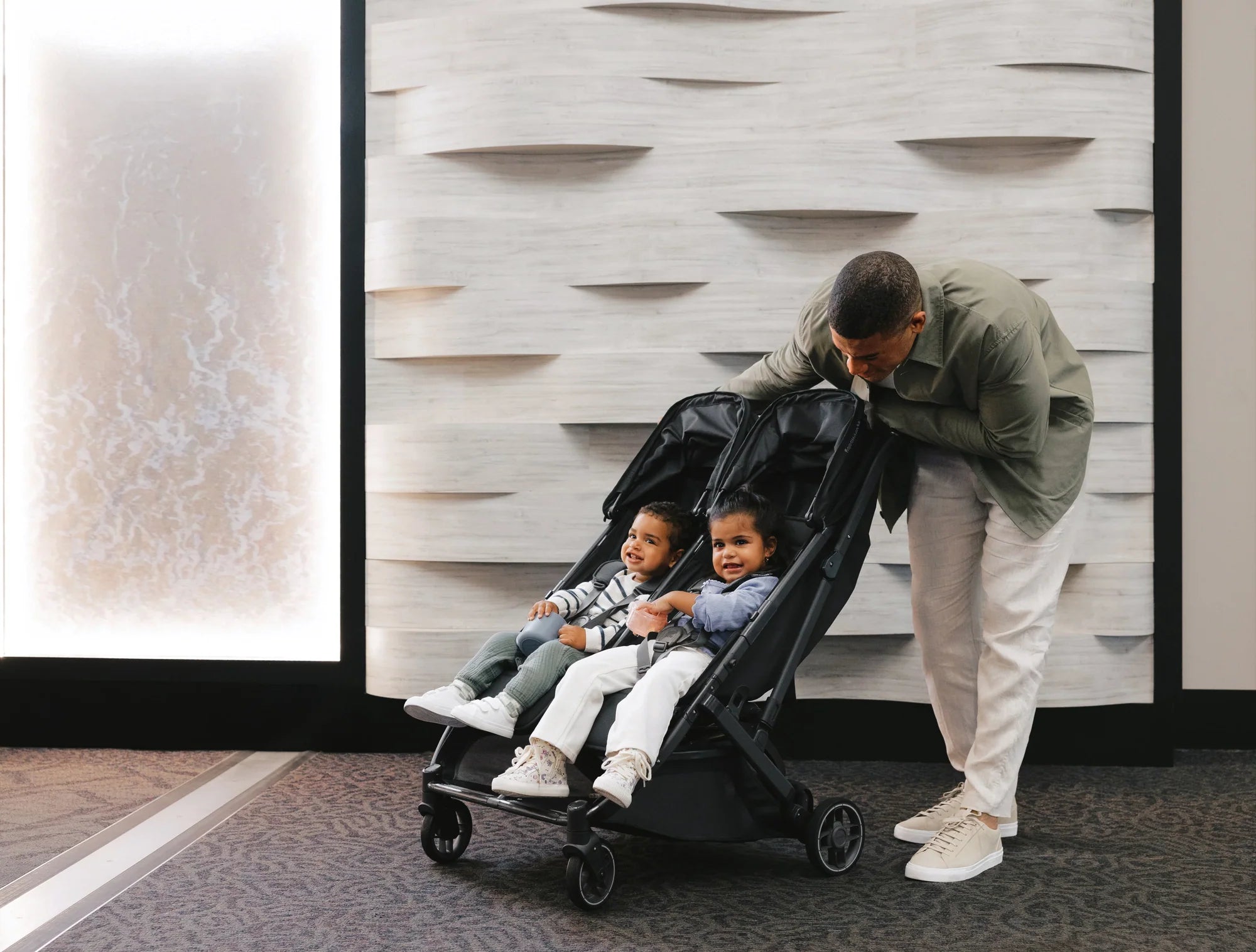 A from-birth, side-by-side compact stroller for two children, allowing you to easily explore as a family wherever your day takes you.